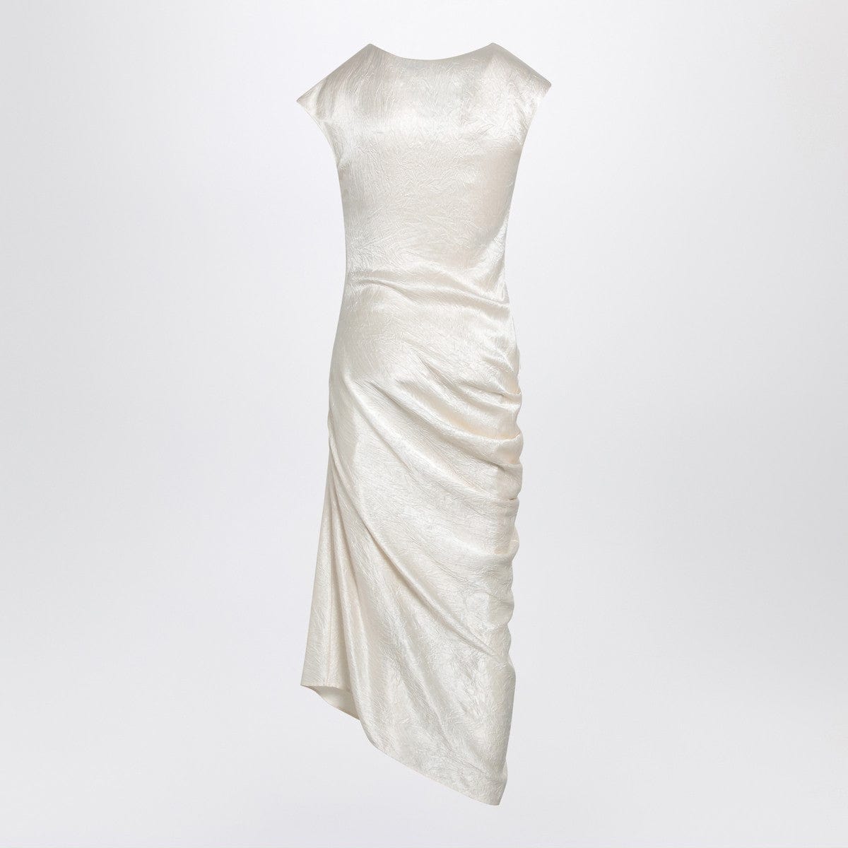 Ivory acetate knit midi dress by Alexander McQueen, featuring a hooded collar, wing sleeves, a zip closure at the back, and draped details.