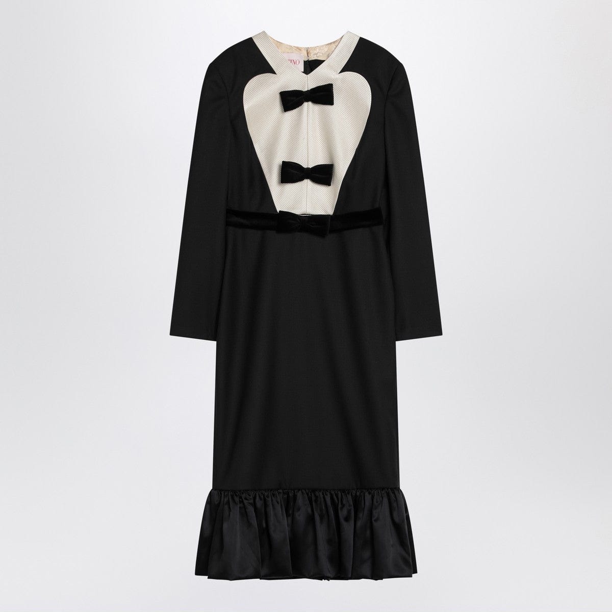 Black virgin wool midi dress by Valentino, characterized by long sleeves with buttoned cuffs, contrasting front insert with velvet bows, satin hem at the bottom, velvet belt with bow and rear zip closure.