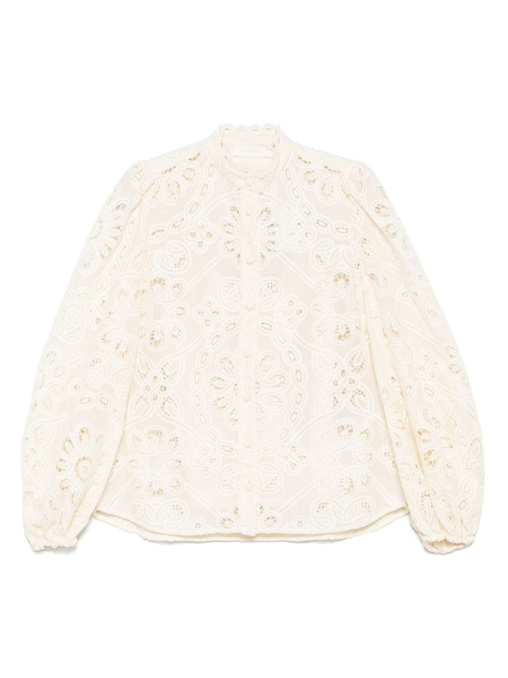 beige front button fastening cut-out floral detailing long sleeves elasticated cuffs Rhiannon embroidered blouse